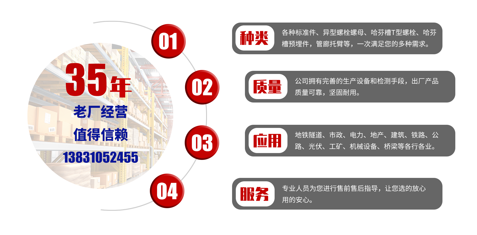 公司产品品类齐全、适配性广,主要涵盖各种标准件、异型螺栓螺母、哈芬槽、T型螺栓、哈芬槽预埋件、管廊托臂、抗震支架、管束、天然气支架、玻璃幕墙T型螺栓及不锈钢异型件定制产品,广泛应用于地铁隧道、市政工程、城市综合管廊、电力基建、房地产、建筑施工、铁路公路、光伏产业、工矿企业、机械设备、桥梁工程等各行各业。凭借优良的产品品质与完善的服务,产品主要出口韩国、德国、埃及、巴西、及东南亚等地,获得国内外客户的一致认可。